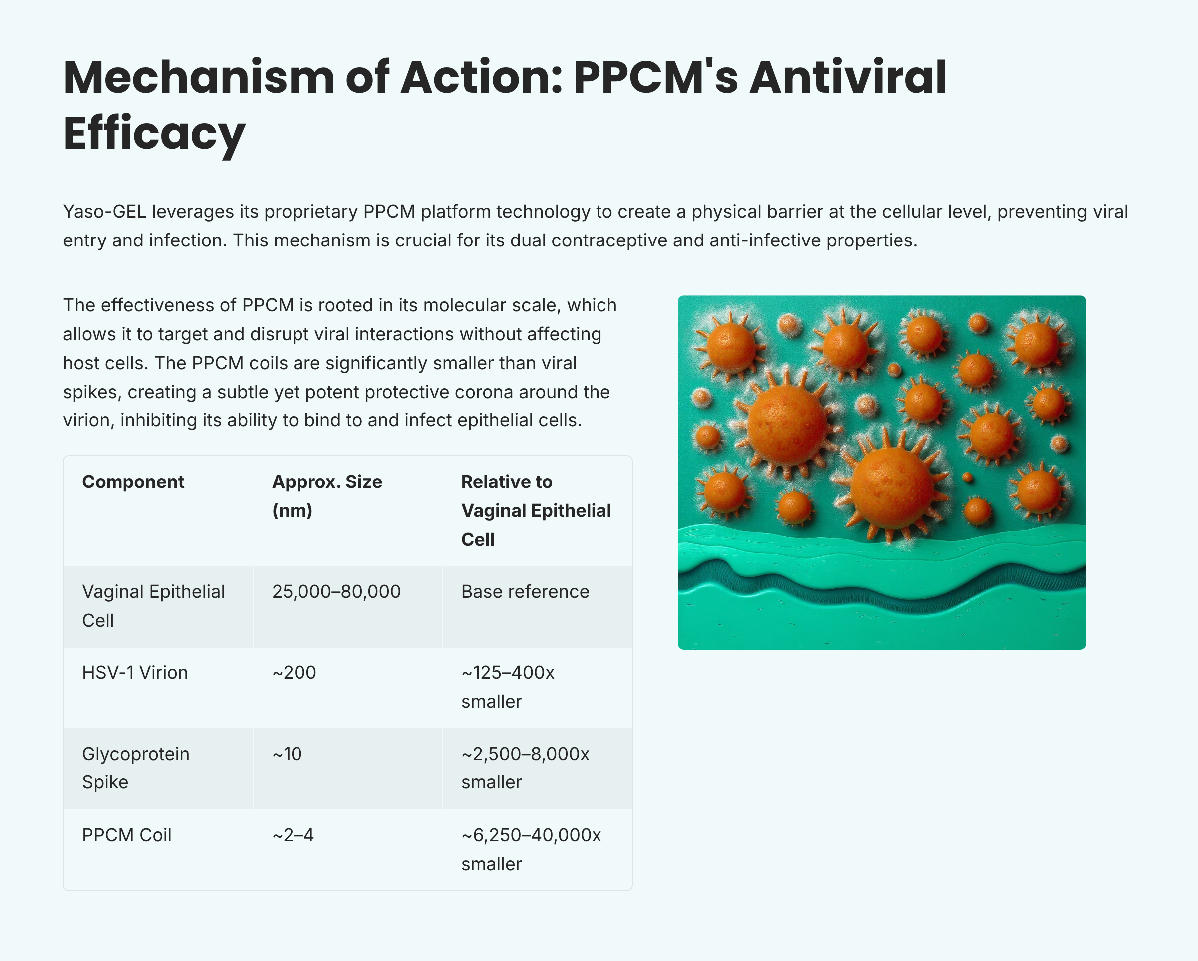 As an anti-viral, PPCM interferes with attachment and fusion of virus to specific receptor sites on the host cell, as well as interfering with entry. In vitro studies indicate PPCM significantly deters herpes simplex, papilloma virus, HIV, SARS-CoV2 and Ebola virus infections. PPCM is a nanoscale polymer (~2–4 nm hydrodynamic size) whose antiviral activity derives from interactions at the nanometer scale. By forming hydrated nanoscale coils, PPCM selectively coats and masks HSV glycoproteins (~10 nm), preventing viral attachment and fusion with epithelial cells. This nanoscale mechanism places PPCM within the domain of nanotechnology-enabled therapeutics, aligning with NIH’s and FDA’s definitions of nanotechnology in medicine.